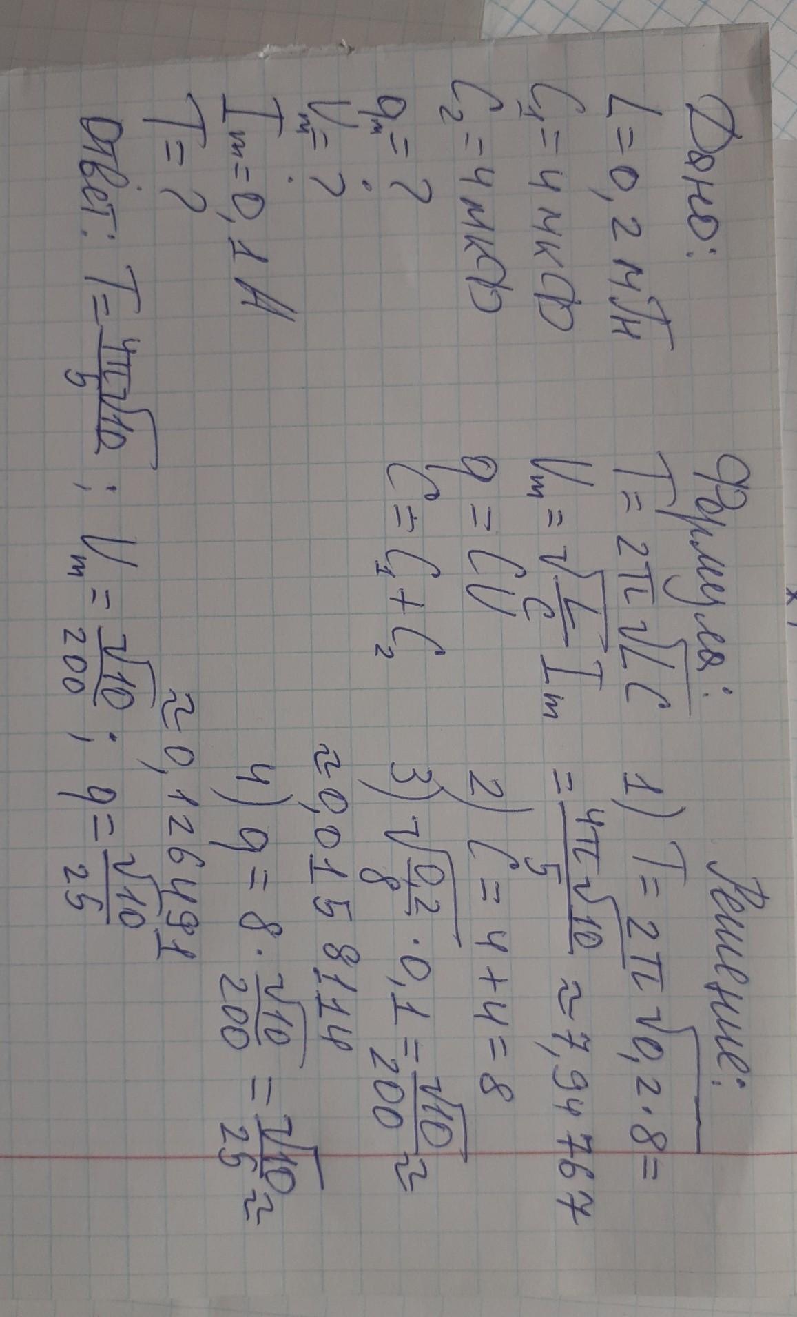 Колебательный контур состоит из катушки индуктивностью L = 0,2 мГн и двух конденсаторов емкостью С1=С2= 4 мкФ, соединенных последовательно. Определить период свободных колебаний в контуре, максимальный заряд конденсатора и максимальное напряжение на каждом конденсаторе. Максимальный ток в цепи Im= 0,1 А.