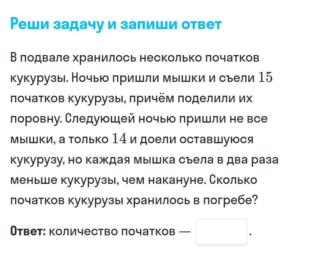 На другую ночь пришли 14 мышек. Съели в 2 раза меньше, то есть по половине початка. Итог: в эту ночь они съели 14*0,5=7 початков.