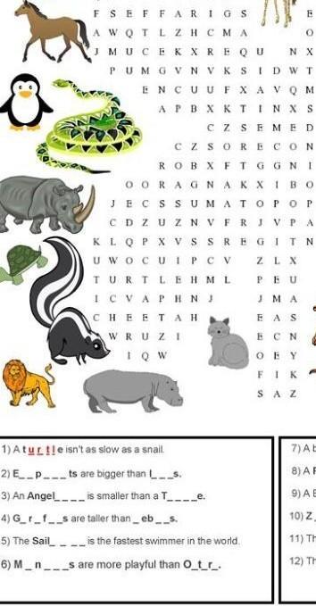 Instructions:Find the name of the animals below in the world puzzle.Then, fill in the blanks using some of the names.