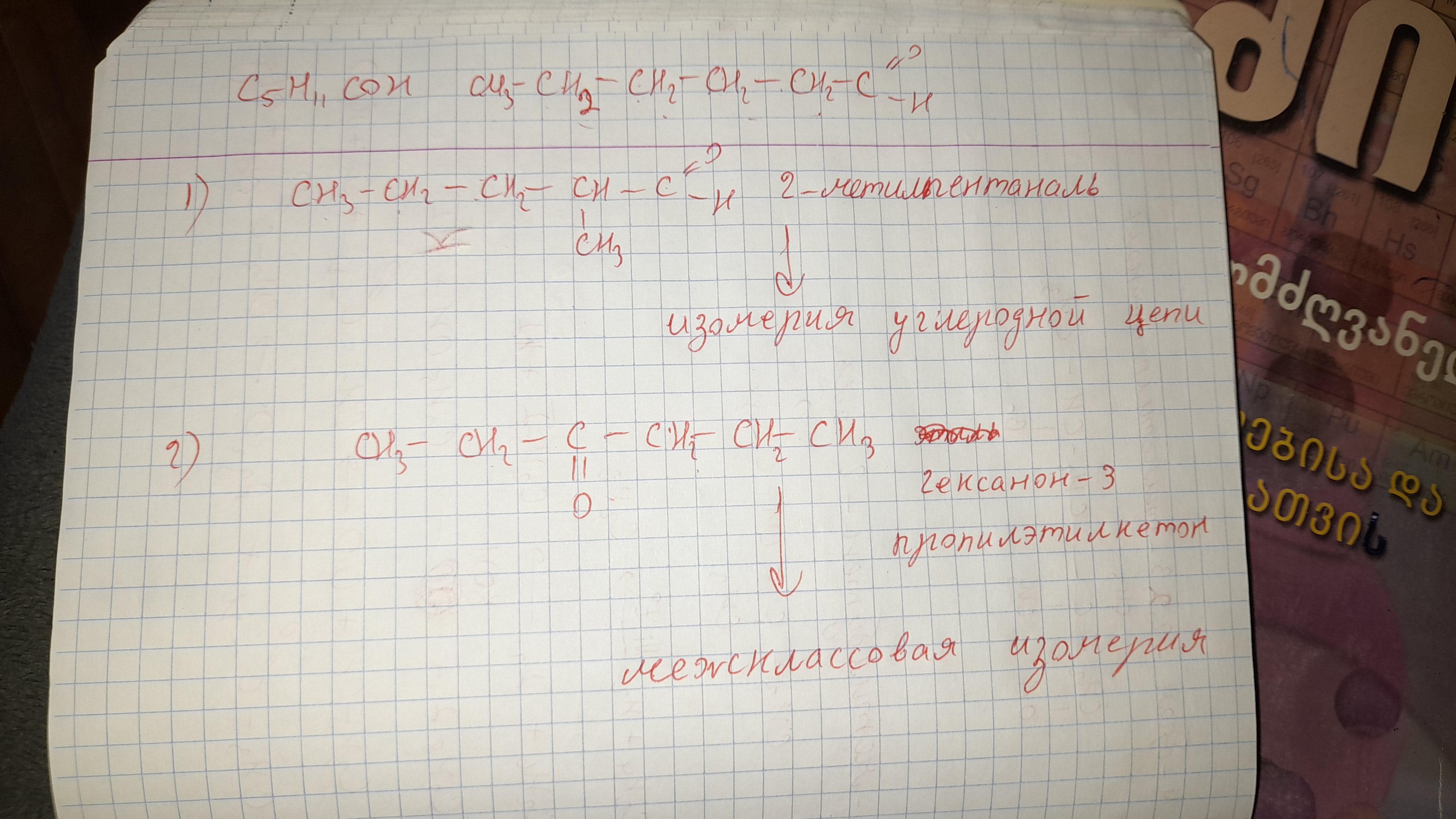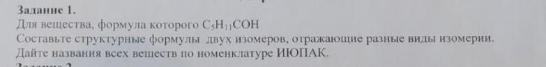 Для вещества C5H11COH нужно составить 2 изомера, отражающие разные виды изомерии.