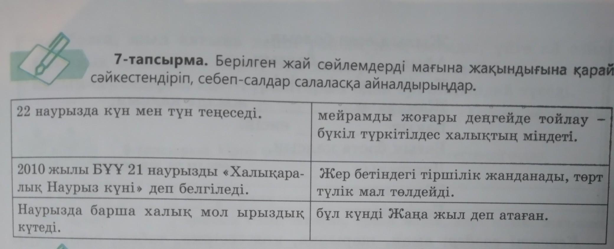 7-тапсырма. Берілген жай сөйлемдерді мағына жақындығына қарай сәйкестендіріп, себеп-салдар салаласқа айналдырыңдар.