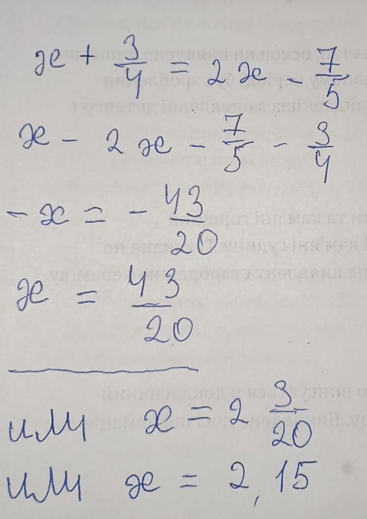 x+3/4=2x-7/5 решите уравнение