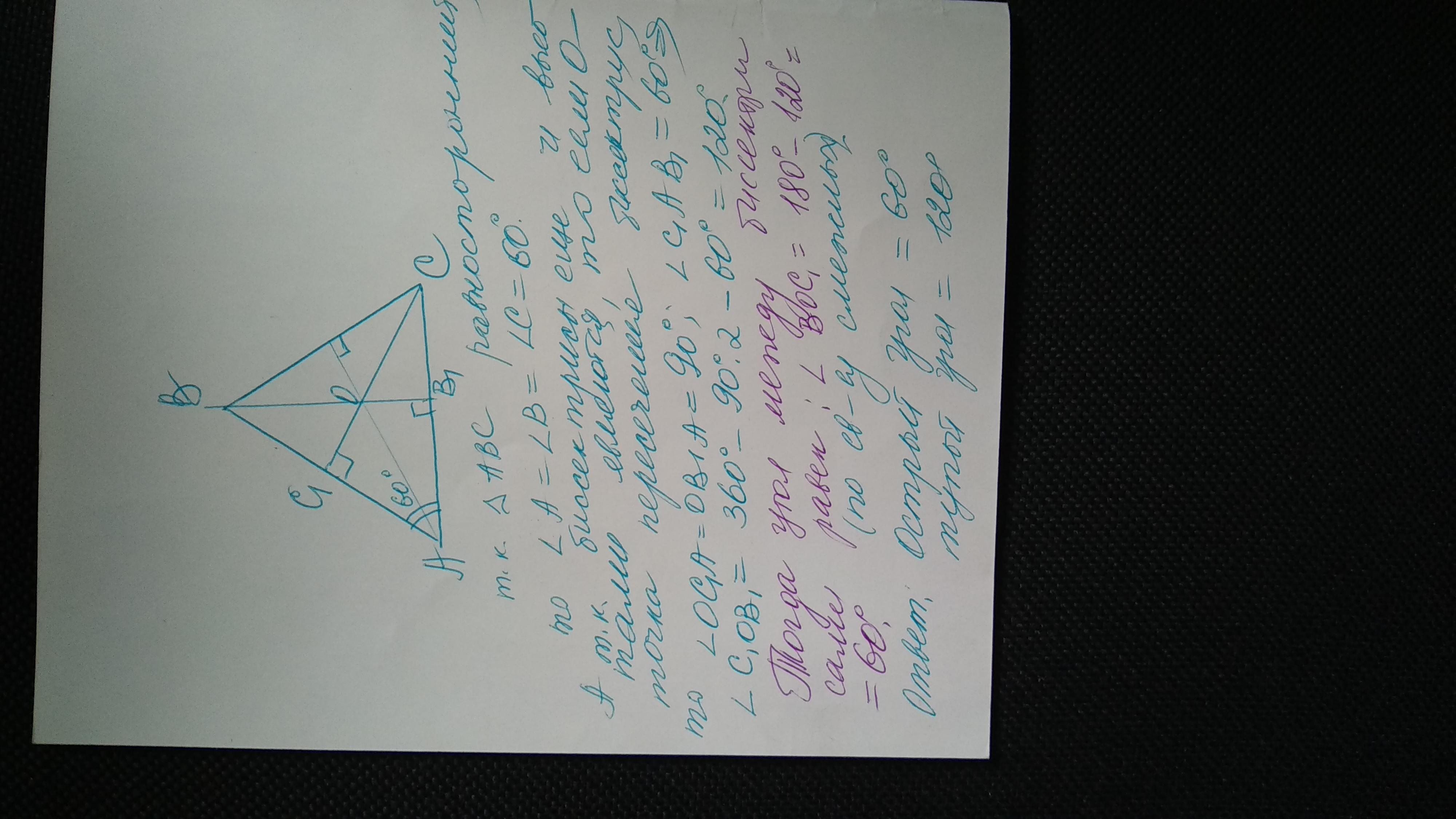 Найдите угол который образуется при пересечении двух биссектрис равностороннего треугольника