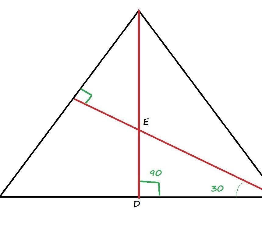 Угол в равностороннем треугольнике равен 60 градусов(180 / 3) значит данный угол разделенной биссектрисой - DBE равен 30 градусов.