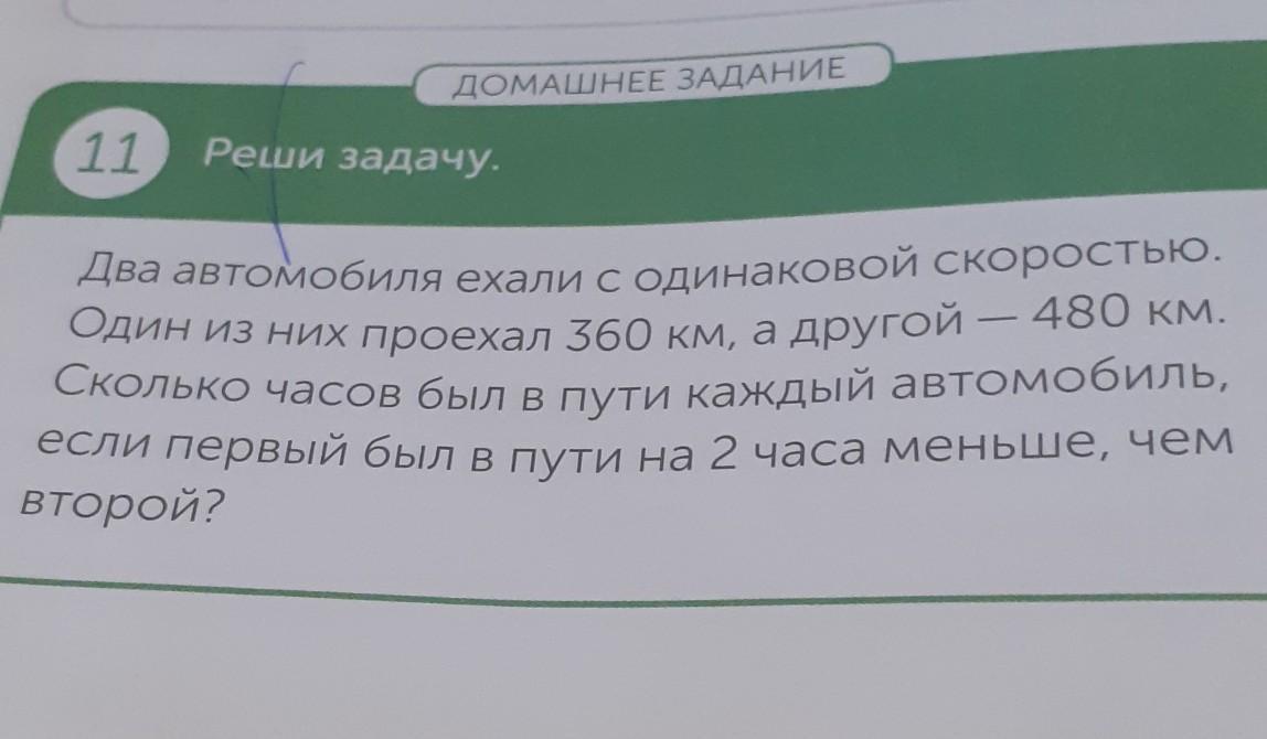 ДОМАШНЕЕ ЗАДАНИЕ 11 Реши задачу. Два автомобиля ехали с одинаковой скоростью. Один из них проехал 360 км, а другой — 480 км. Сколько часов был в пути каждый автомобиль, если первый был в пути на 2 часа меньше, чем второй?