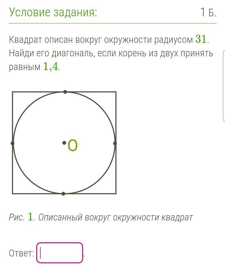 сторона квадрата равна диаметру окружности, то есть 62. диагональ квадрата равна стороне, поделенной на синус 45 градусов.