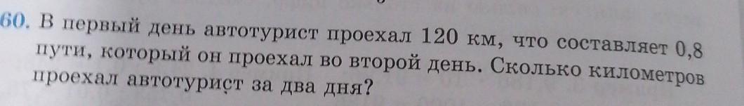 960. В первый день автотурист проехал 120 км, что составляет 0,8 пути, который он проехал во второй день. Сколько километров проехал автотурист за два дня? Пошуласта на бумашке