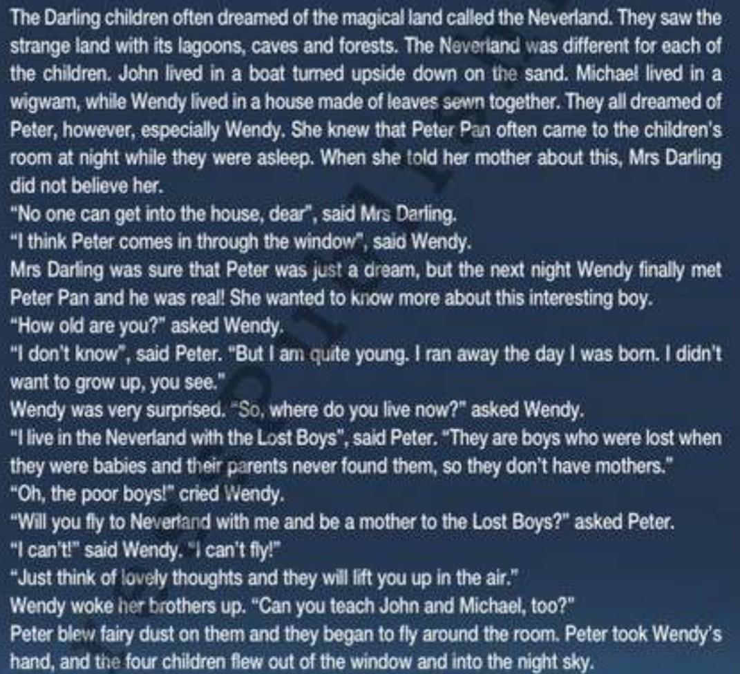 Дарлинг балалары «Неверланд» деп аталатын сиқырлы жерді жиі армандайтын. Олар лагуналары, үңгірлері мен ормандары бар бөтен жерді көрді. Neverland балалардың әрқайсысы үшін әртүрлі болды. Джон құмда төңкерілген қайықта өмір сүрді. Майкл вигвамда тұрды, ал Вэнди жапырақ тігілген үйде тұрды. Олардың бәрі Питер туралы армандады, әсіресе Венди. Ол Питер Пал балалар ұйықтап жатқанда түнде олардың бөлмесіне жиі келетінін білді. Бұл туралы анасына айтқанда, Дарлинг ханым оған сенбеді. «Ешкім үйге кіре алмайды, қымбаттым, - деді Дарлинг ханым. Питер терезеден кіреді деп ойлаңыз, - деді Вэнди. Миссис Даринг Питер жай ғана арман екеніне сенімді болды, бірақ келесі түні Венди Питер Панды кездестірді және ол шынымен де болды. Ол осы қызықты бала туралы көбірек білгісі келді. «Сен қанша жастасың?» — деп сұрады Вэнди. Мен білмеймін,— деді Петір.— Бірақ мен жаспын. Мен дүниеге келген күні қашып кеттім. Менің есейгім келмеді, көрдің бе." Вэнди қатты таң қалды. "Сонымен, сен қазір қайда тұрасың?" - деп сұрады Вэнди. "Жоғалған ұлдармен бірге TIve in Neverland", - деді Питер. - Олар ұлдар олар сәби кезінде жоғалған, ал ата-аналары оларды ешқашан таппаған, сондықтан олардың аналары жоқ." "О, бейшара балалар!" деп айқайлады Вэнди. "Сен менімен бірге Неверандқа ұшып, Жоғалған ұлдарға ана боласың ба? — деп сұрады Питер. Мен алмаймын,— деді Вэнди. «Мен ұша алмаймын!» «Тамаша ойлар туралы ойланыңыз, сонда олар сізді ауада шығарады». Вэнди ағаларын оятты. — Сіз Джон мен Майклға да үйрете аласыз ба? Петр оларға ертегі шаңын үрлеп, олар бөлмені айналып ұшып кете бастады. Питер Вендидің қолын алды, төрт бала терезеден ұшып, түнгі аспанға көтерілді.