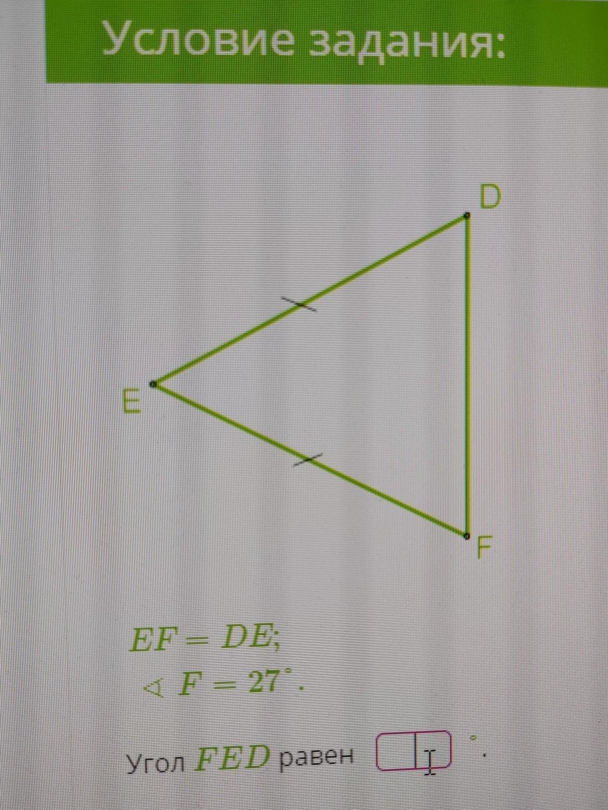 2) ∠FED = 180° - (27° × 2) = 126° (Сумма углов треугольника равна 180°).