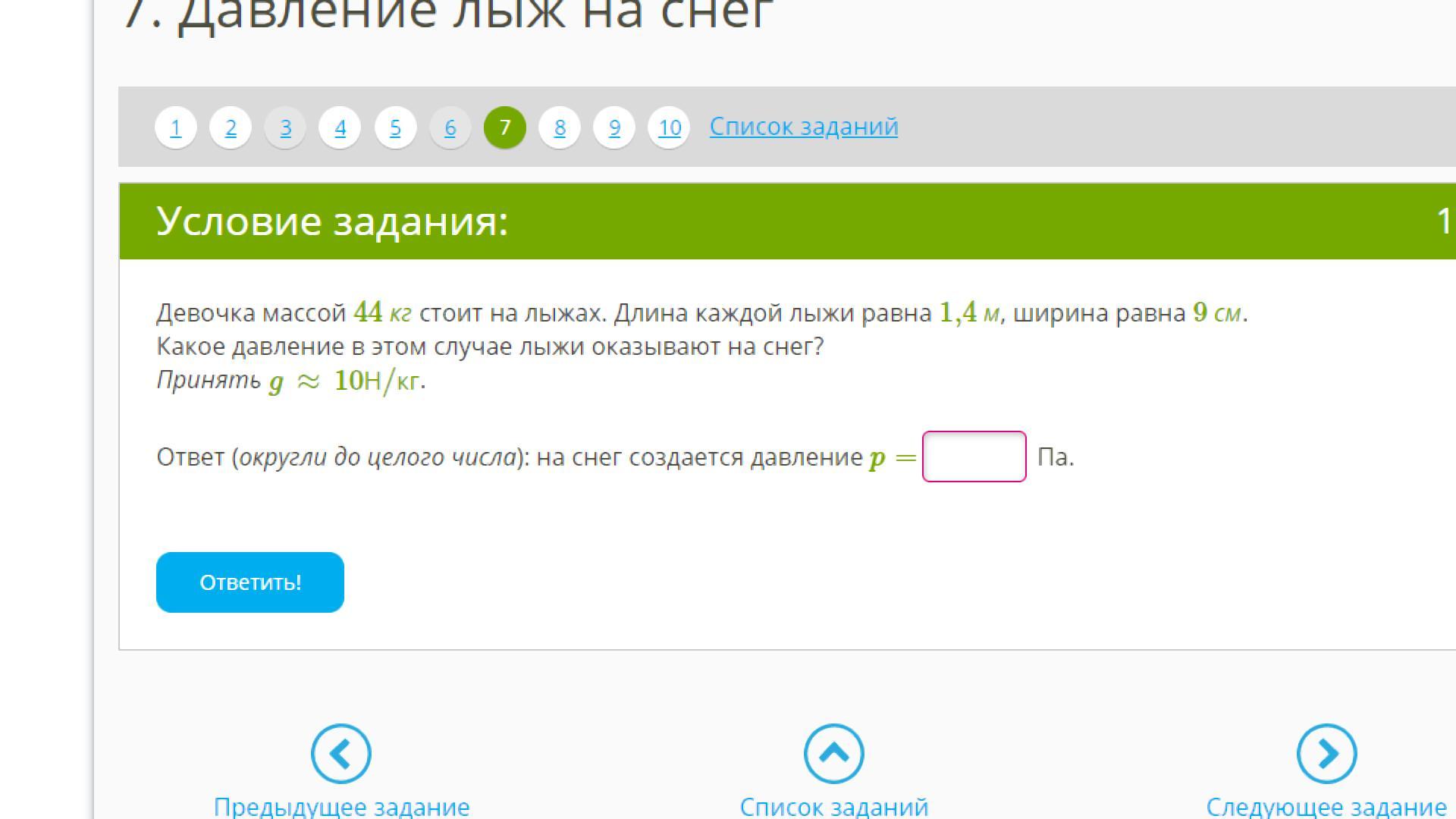 P = mg / s = mg / (a*b) = 44 * 10 / (2 * 0,09 * 1,4) = 440 / 2 * 0,126 ≈ 1750 (Па)