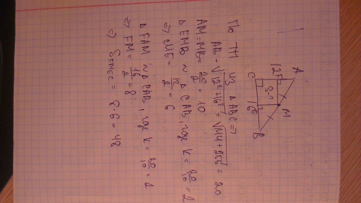 12*12=144 16*16=256 144+256=400 квадратный корень из 400 - 20(гипотенуза)полгипотенузы - 10 стороны получаются 6 и 8 см 6*8=48 см.