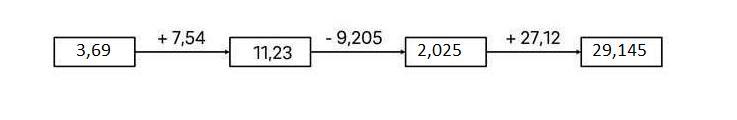 3,69 + 7,54 = 11,23 - 9,205 = 2,025 + 27,12 = 29,145