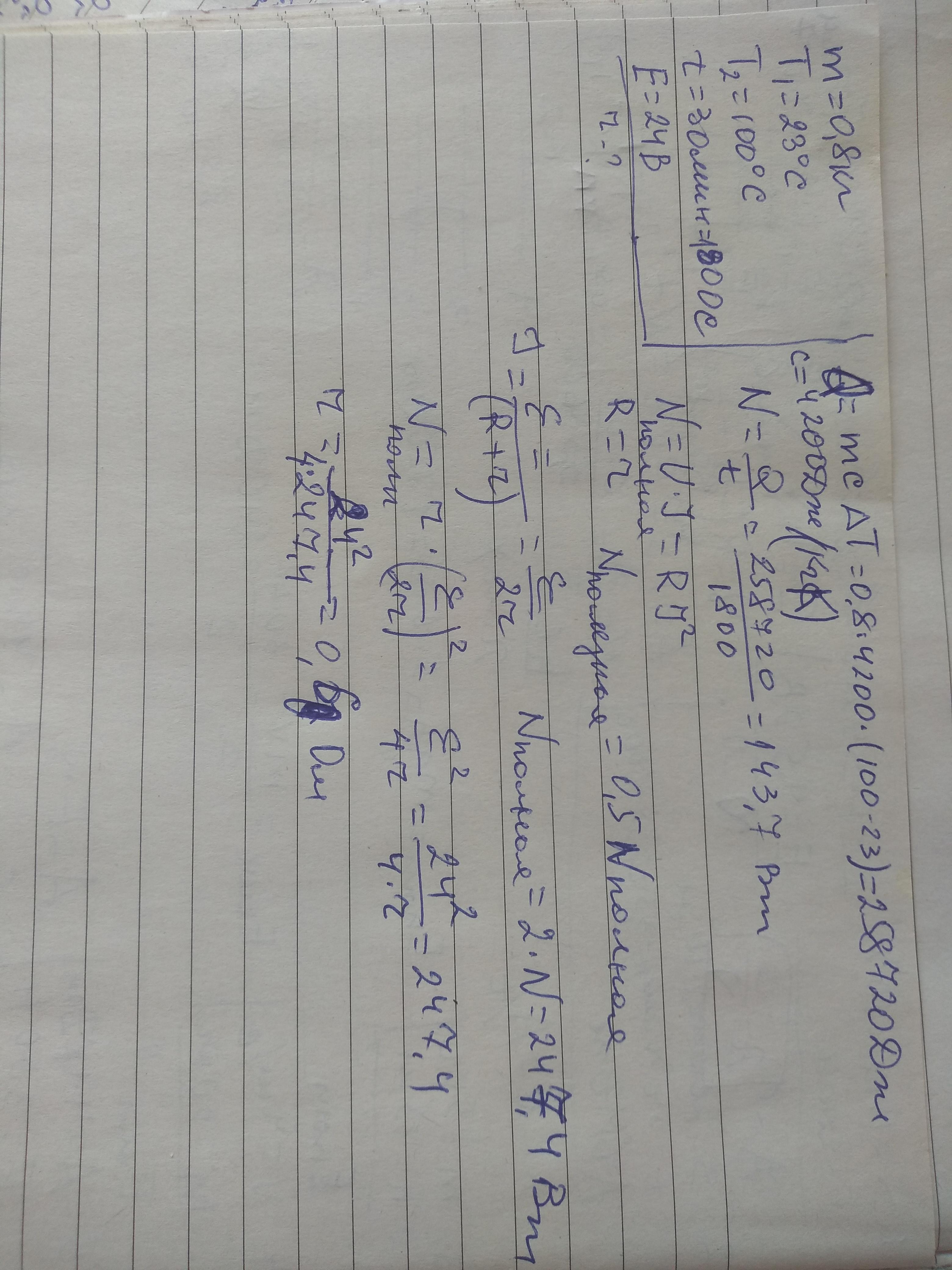 Воду, масса и первоначальная температура которой m = 0.80 кг и t = 23°C соответственно, вскипятили за промежуток времени t = 30 мин, используя нагреватель, подключённый к источнику тока с ЭДС E = 24В. Определите внутреннее сопротивление источника тока, если полезная мощность тока в цепи максимальна. Тепловыми потерями при нагревании воды пренебречь.