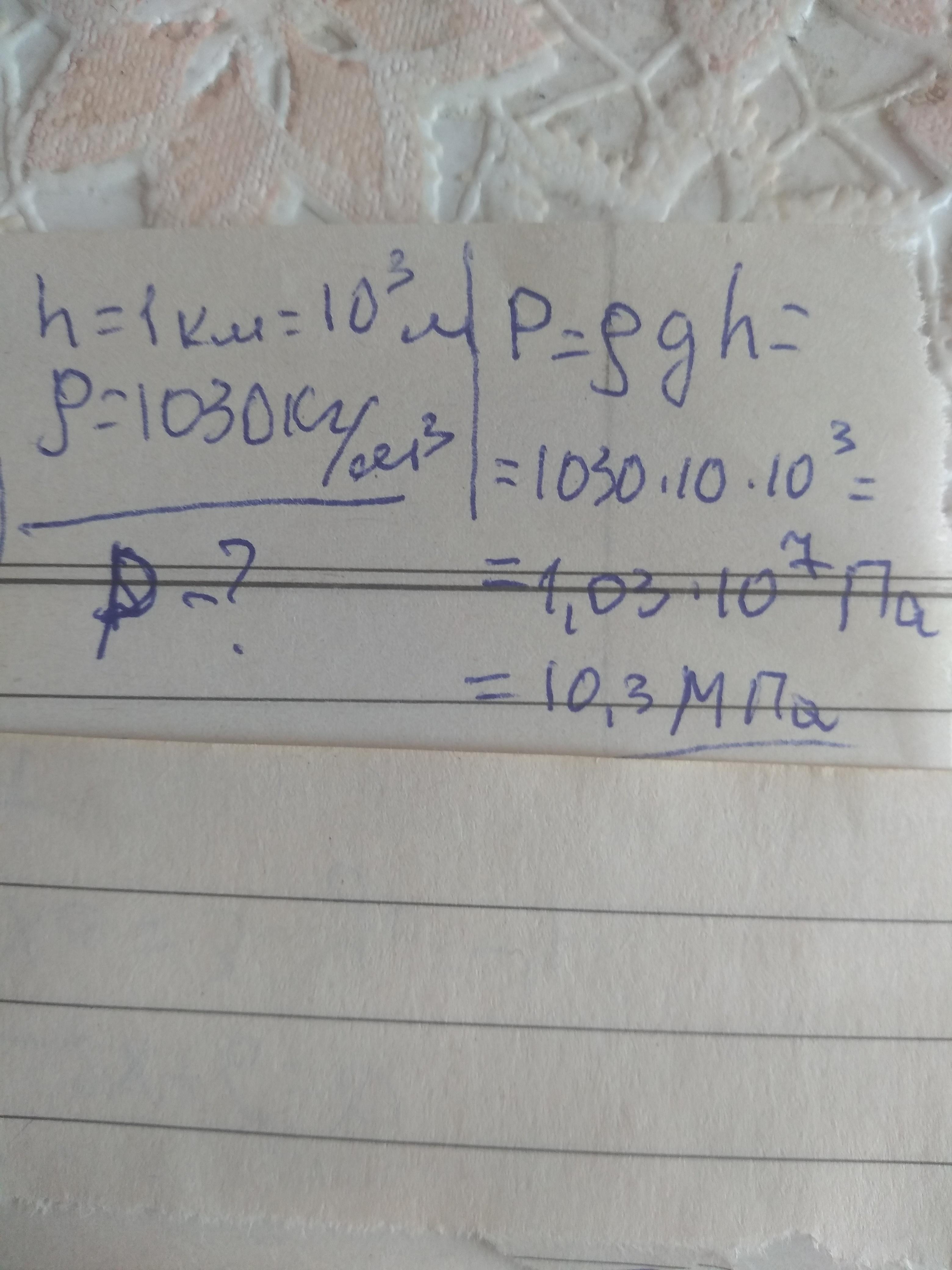 Рассчитайте какое давление оказывает морская вода на глубине 1 км если её плотность 1030 кг/м 3