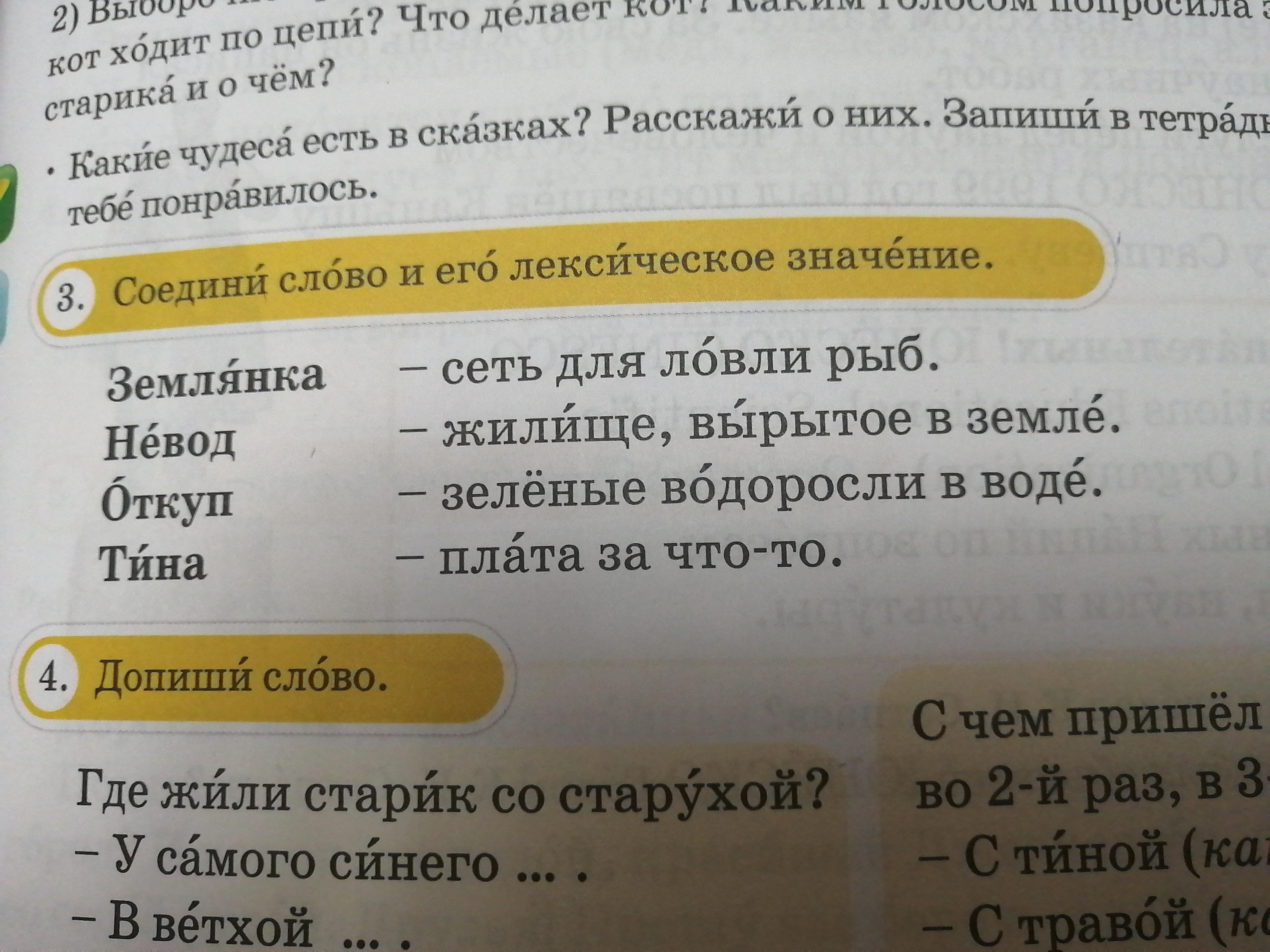 Ответ: Землянка - жилище, вырытое в земле. Невод - сеть для ловли рыб. Откуп - плата за что-то. Тина - зеленые водоросли в воде