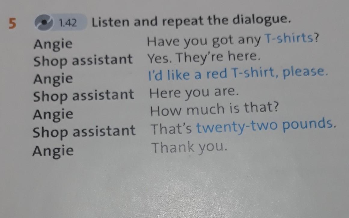 Объяснение:T-Shirts-футболки,I'd like a red T-shirt please-Я предпочитаю красную футболку, пожалуйста, twenty-two pounds-22 фунтов(стерлингов)