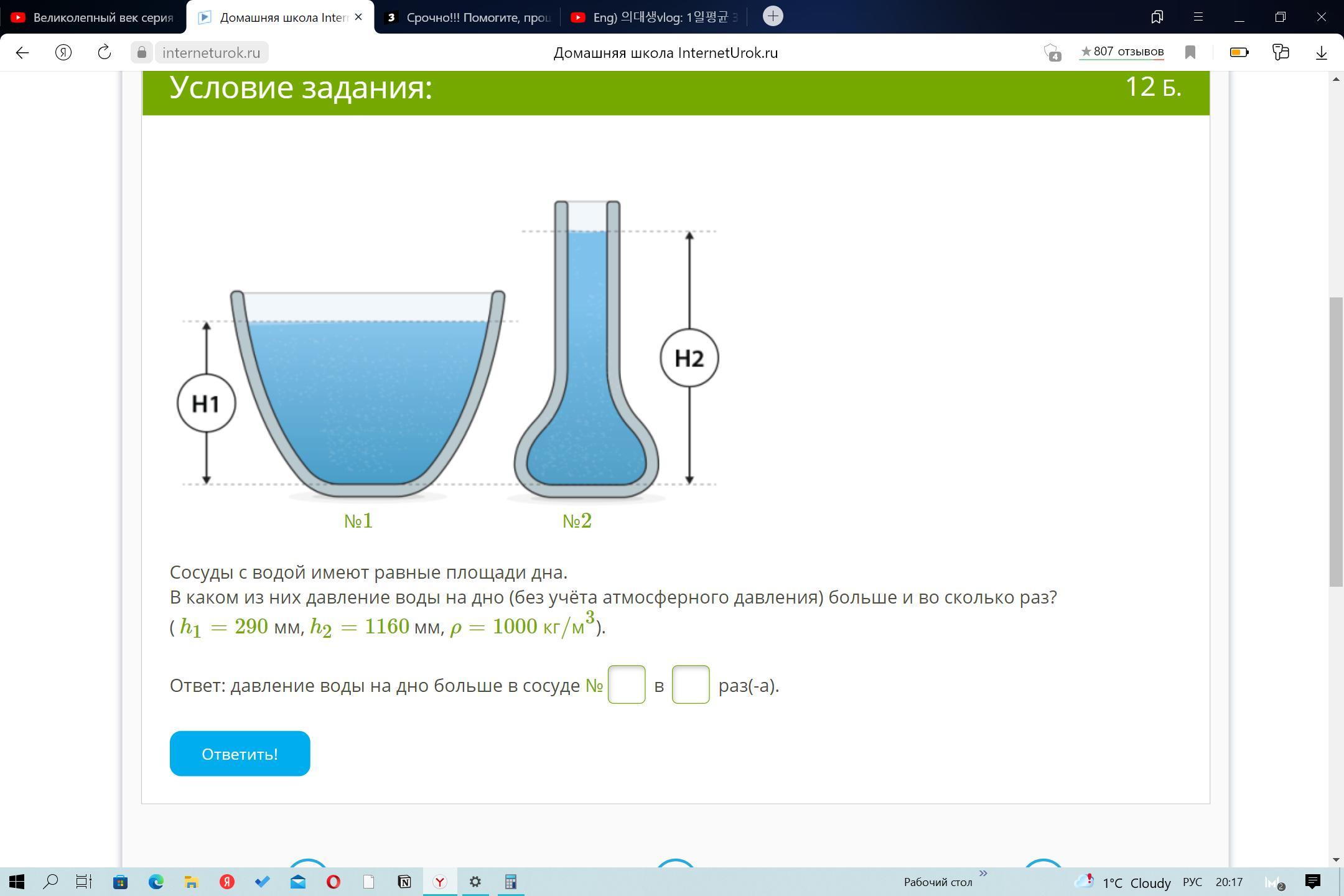 Сосуды с водой имеют равные площади дна. В каком из них давление воды на дно больше и во сколько раз?