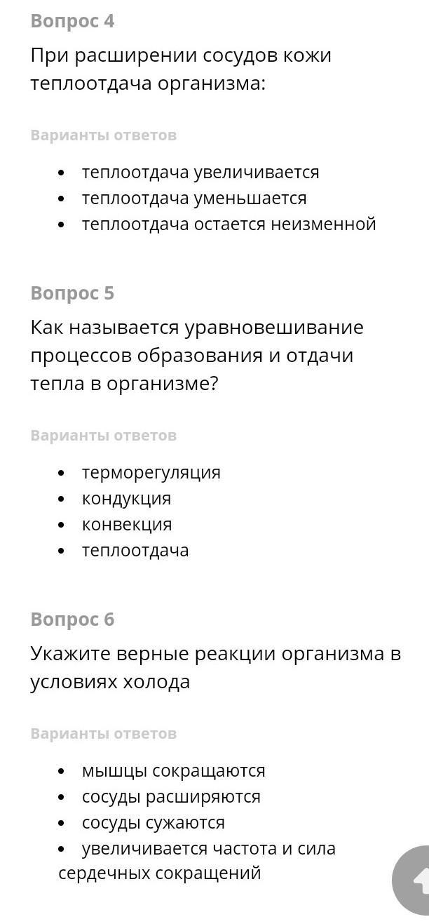 Ответ: Вопрос 4 : теплоотдача уведичивается. Вопрос 5 : терморегуляция. Вопрос 6: сосуды сужаются, увеличивается частота и сила сердечных сокращений.