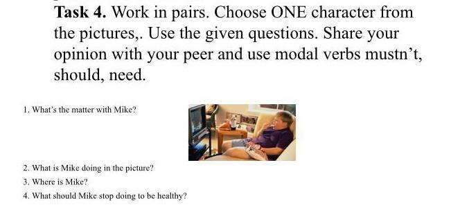 Task 4. Work in pairs. Choose ONE character from the pictures,. Use the given questions. Share your opinion with your peer and use modal verbs mustn't, should, need. 1. What's the matter with Mike? 2. What is Mike doing in the picture? 3. Where is Mike? 4. What should Mike stop doing to be healthy? буду благодарна за ответ!