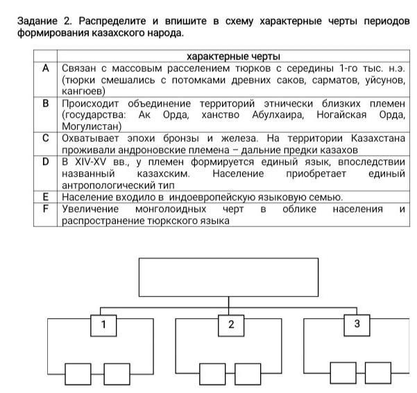 Задание 2. Распределите и впишите в схему характерные черты периодов формирования казахского народа. характерные черты Связан с массовым расселением тюрков с середины 1-го тыс. н.э. (тюрки смешались с потомками древних саков, сарматов, уйсунов, кангюев) В Происходит объединение территорий этнически близких племен (государства: Могулистан) Охватывает эпохи бронзы и железа. На территории Казахстана проживали андроновские племена-дальние предки казахов В XV-XV вв., у племен формируется единый язык, впоследствии названный антропологический тип Е Население входило в индоевропейскую языковую семью. Увеличение распространение тюркского языка А Ак Орда, ханство Абулхаира, Ногайская Орда, казахским. Население приобретает единый монголоидных черт облике населения