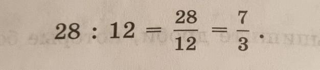 28 : 12 = 28/12 = (28:4)/(12:4) = 7/3