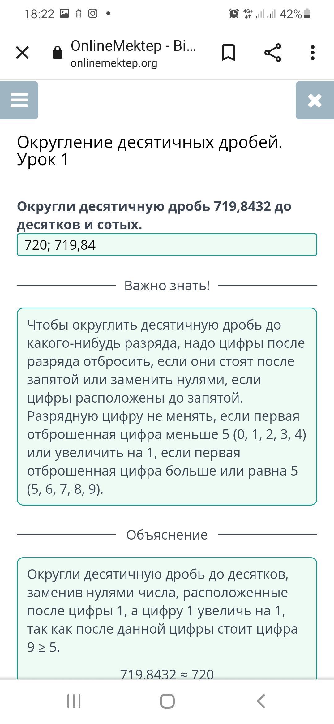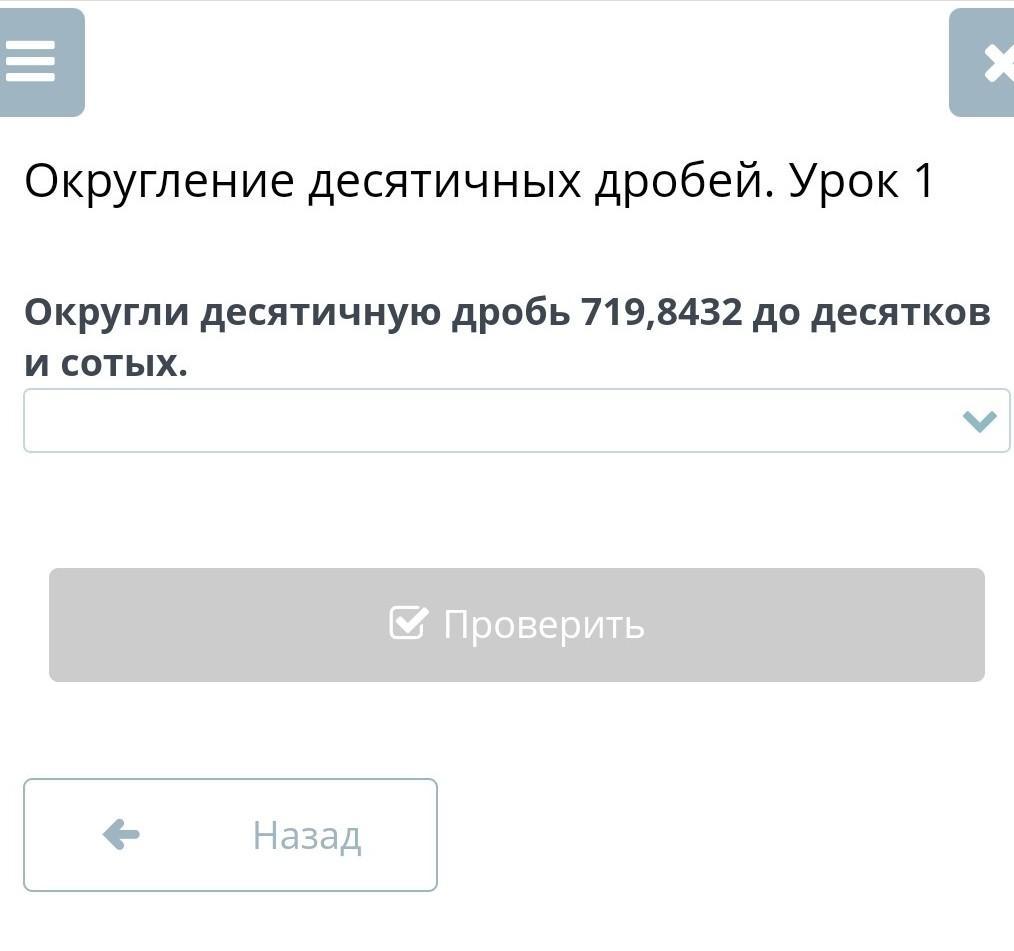 Округление десятичных дробей. Урок 1 Округли десятичную дробь 719,8432 до десятков и сотых. Назад Проверить