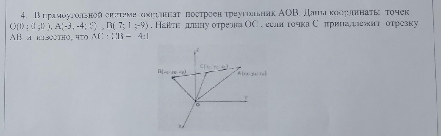 4. В прямоугольной системе координат построен треугольник АОВ. Даны координаты точек О(0 ; 0;0), А(-3; -4; 6) , B( 7; 1;-9). Найти длину отрезка ОС , если точка С принадлежит отрезку AB и известно, что АС : CB = 4:1 9