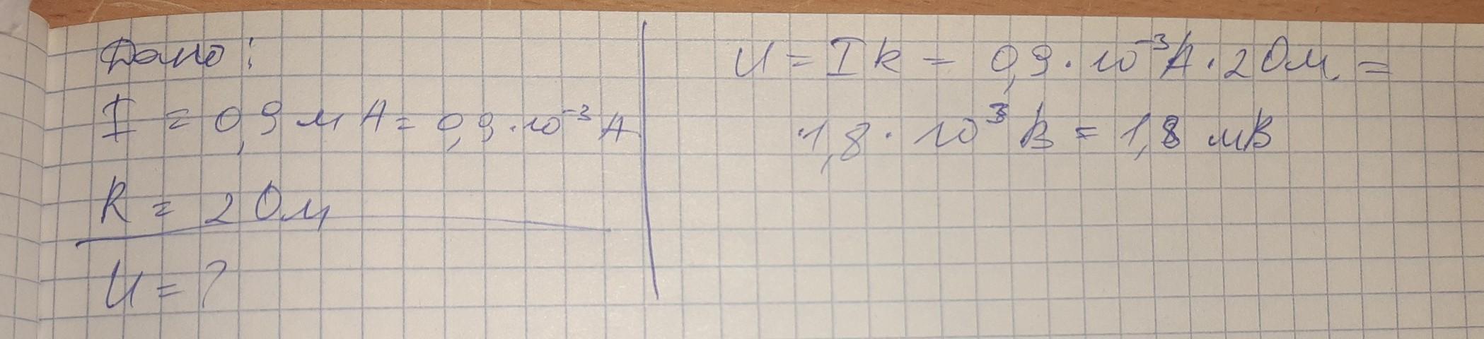 чему равно напряжение в электрической цепи, если сила тока в ней равна 0,9 мА сопротивление 2 ома?