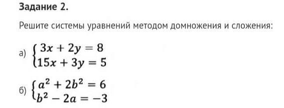Задание 2. Решите системы уравнений методом домножения и сложения: а) Skrinshot 11-10-2021 220414.png Skrinshot 11-10-2021 220456.png