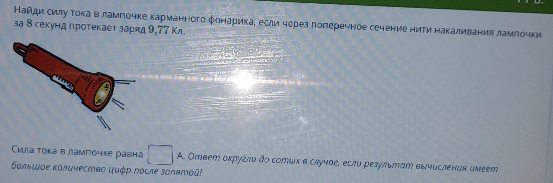 Найди силу тока в лампочке карманного фонарика, если через поперечное сечение нити накаливания лампочки за 8 секунд протекает заряд 9,77 Кл. Сила тока в лампочке равна .......А. Ответ округли до сотых в случае, если результат вычисления имеет большое количество цифр после запятой!
