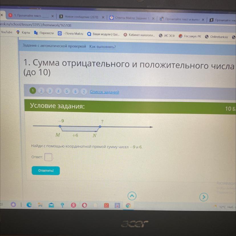 Найди с помощью координатной прямой сумму чисел -9 и 6.