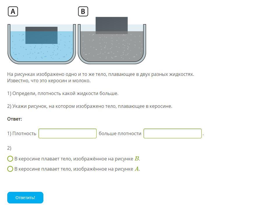 2) Укажи рисунок, на котором изображено тело, плавающее в керосине.