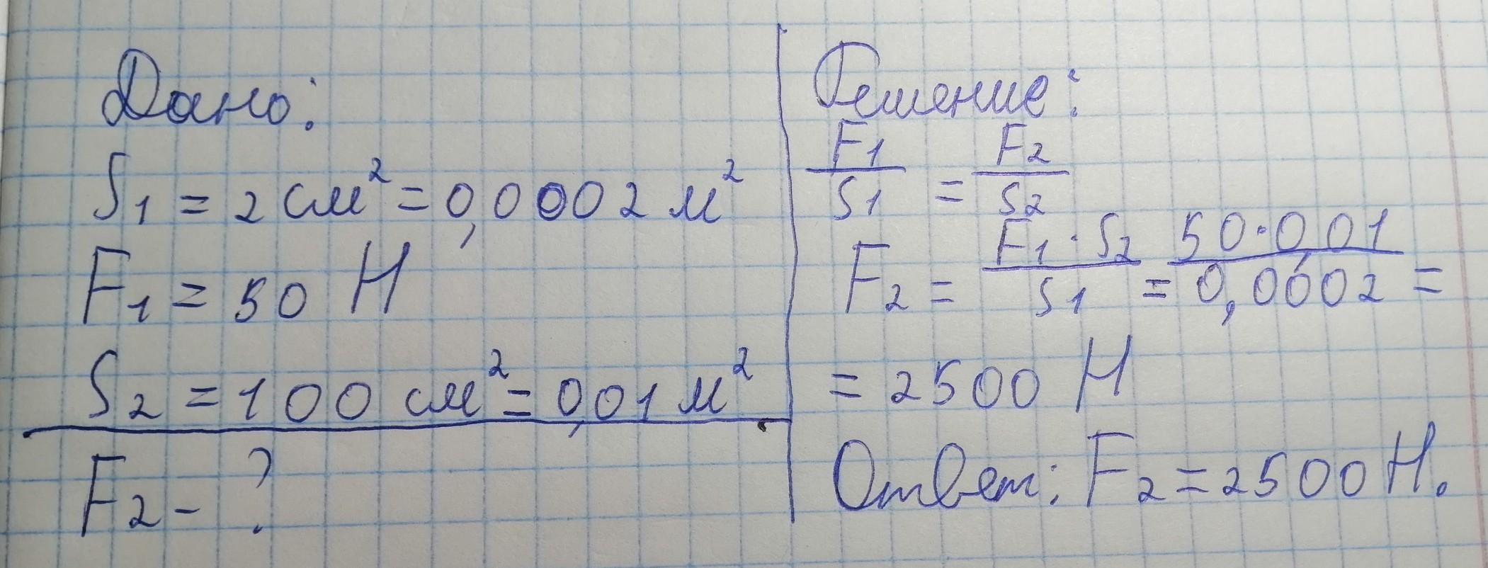 На меньший поршень гидравлической машины площадью 2 см2 действует сила 50 Н. Какую силу давления будет создавать больший поршень, площадь которого 100 см2?