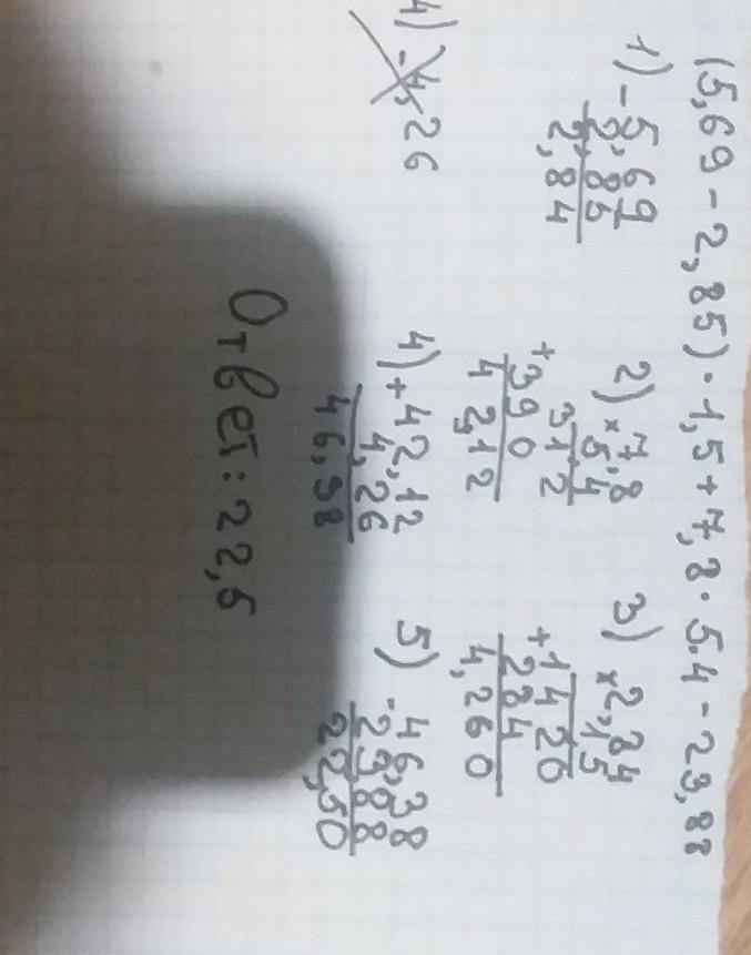 (5,69-2,85)×1,5+7,8×5,4-23,88=2, 84*1, 5+42,12-23, 88=