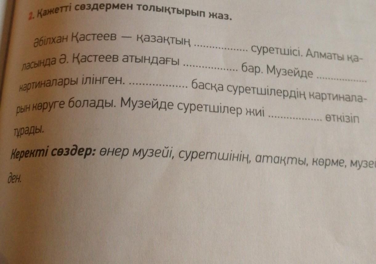 . 2. Қажетті сөздермен толықтырып жаз. Әбілхан Қастеев – қазақтың ласында Ә. Қастеев атындағы суретшісі. Алматы қа- бар. Музейде ... басқа суретшілердің картинала- Өткізіп картиналары ілінген. рын көруге болады. Музейде суретшілер жиі. тұрады.