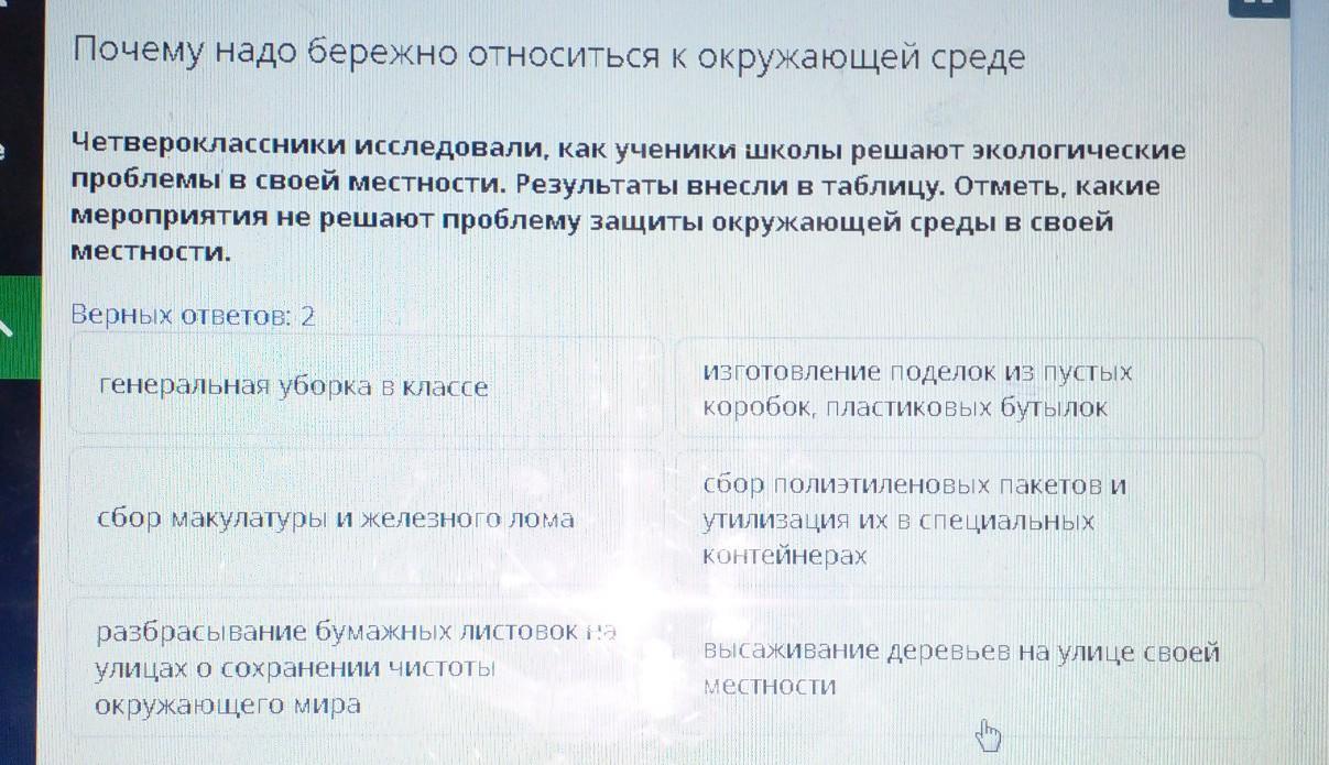 Четвероклассники исследовали, как ученики школы решают экологические проблемы в своей местности. Результаты внесли в таблицу. Отметь, какие мероприятия не решают проблему защиты окружающей среды в своей месТНОСТИ.