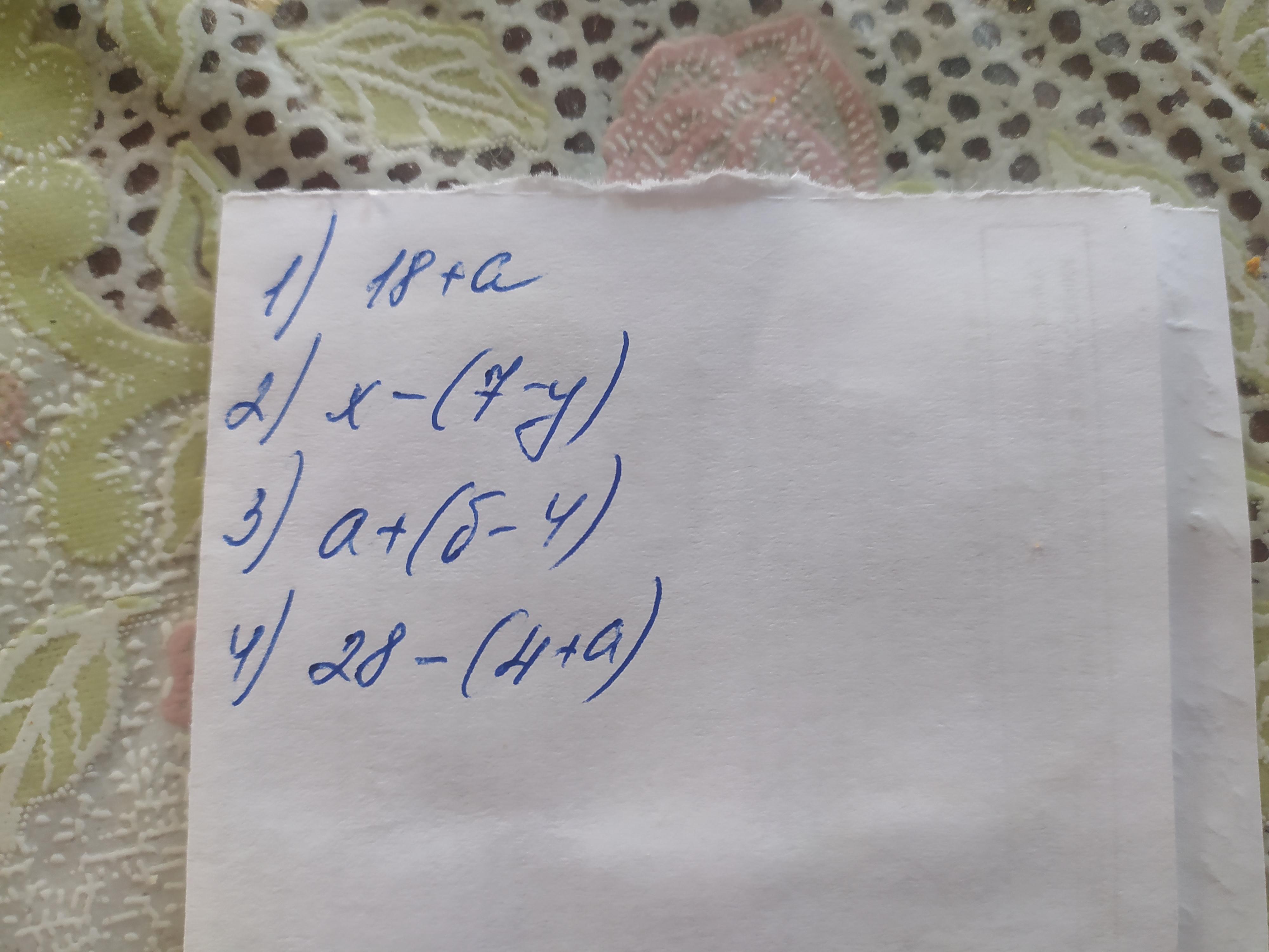Составьте выражения: 1) Сумма числа 18 и а; 2) Разность xи выражения 7-у; 3) Сумма а и выражения Б-4; 4) Разность числа 28 и выражения 4+а.