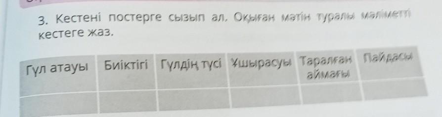 3. Кестені постерге сызып ал. Оқыған мәтін туралы мәліметті кестеге жаз. Гүл атауы Биіктігі Гүлдің түсі Биіктігі Гүлдің түсі ұшырасуы таралған Пайдасы аймағы