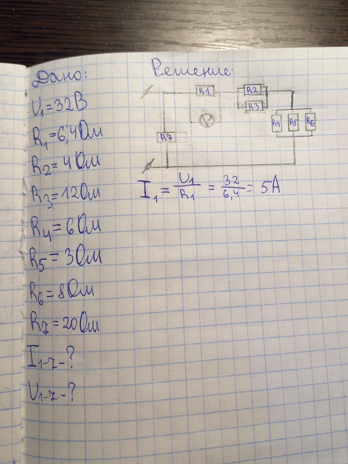 Первое действие выполнено, дальше ток растекается между R2 и R3 — у первого напряжение U=4I', у второго U=12I, знаичт I'=3I, значит в R2 потечёт в 3 раза больший ток, чем в R3, т.е. 15/4А и 5/4А соответственно. Напряжения на них тогда U=12*5/4=15В. Далее ращветвление между R4, R5, R6. Напряжения на них U=6i=3i'=8i'' => 2i=i'; 0.75i=i''. Значит, выражая всё через i, получаем, что 5А=i+2i+0.75i=3.75i; i=1.(3)А — в четвёртом резисторе, 2i=2.(6)А — в пятом, 0.75i=1А — в шестом. Напряжения на них U1=6*1.(3)=8В. На 7 резисторе напряжение такое же, как Uo=32В+15В+8В=55В (параллельноесоединение). А ток на нём I=Uo/R7=2.75А
