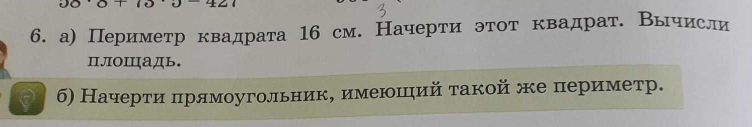6. а) Периметр квадрата 16 см. Начерти этот квадрат. Вычисли площадь. б) Начерти прямоугольник, имеющий такой же периметр.