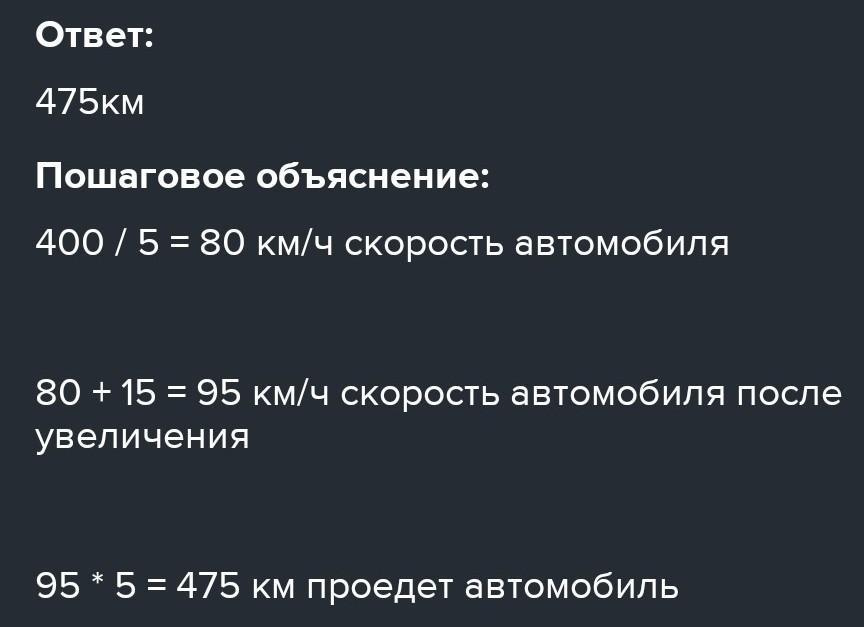 Автомобиль за 5 часов проехал 400 км. Какое расстояние проедет автомобиль за это же время, если увеличит скорость на 15 км/ч можно циркулем пожалуйста поставлю 20 баллов