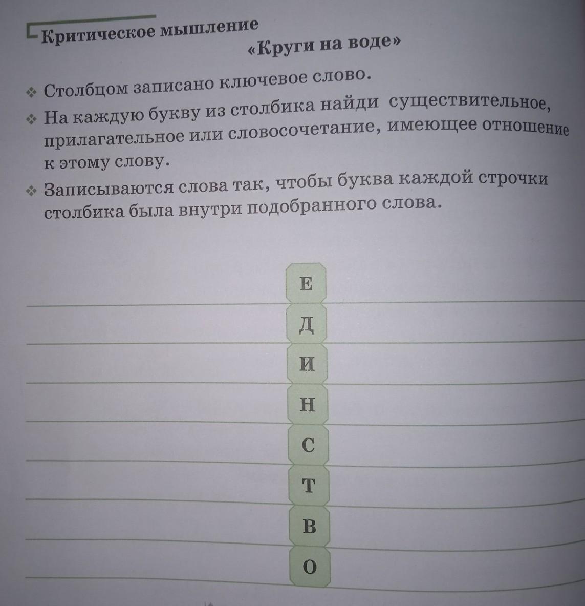 Критическое мышление «Круги на воде» Столбцом записано ключевое слово. На каждую букву из столбика найди существительное, прилагательное или словосочетание, имеющее отношение к этому слову. Записываются слова так, чтобы буква каждой строчки столбика была внутри подобранного слова. E Д И H С T B О помогите пожалуйста срочно