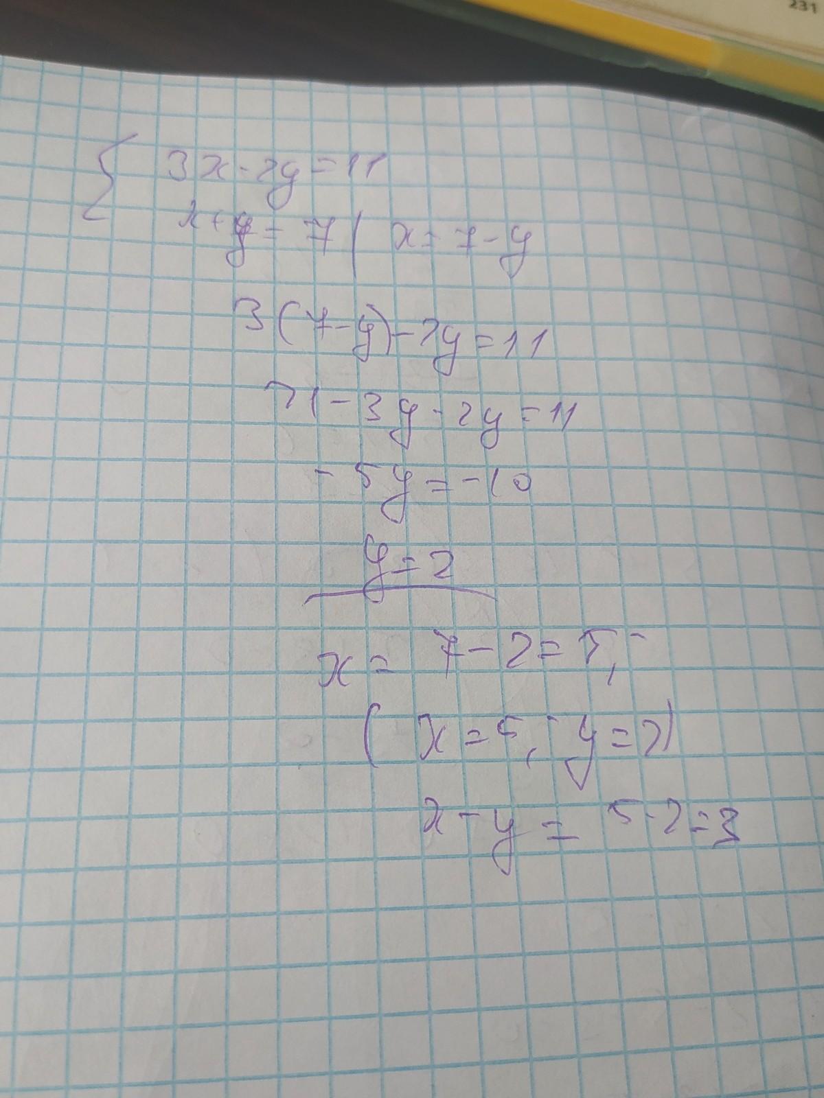Решите систему уравнений {3x−2y=11