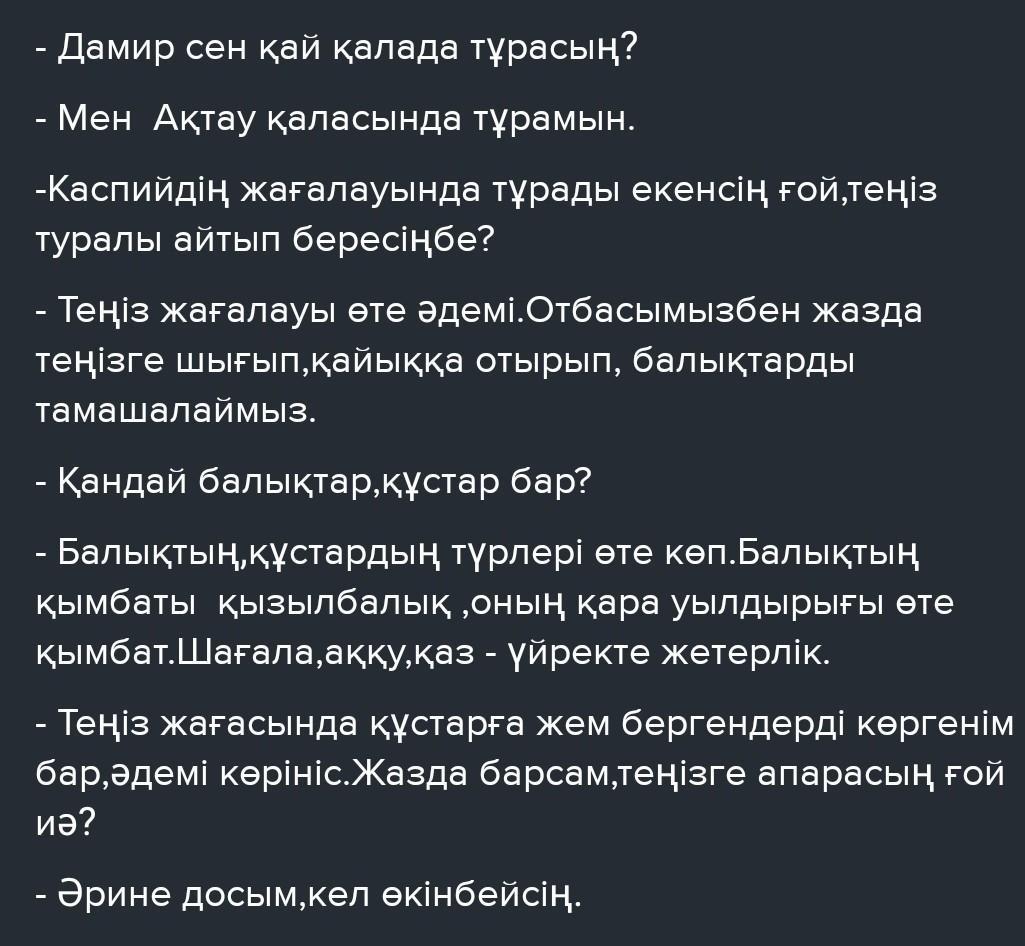 4. Мәтінді шолып оқы. Теңіз маңында бойында орналасқан. Каспий теңізі өте үлкен. Теңіз сол- Мен Ақтауда тұрамын. Ақтау қаласы Каспий теңізінің түстіктен оңтүстікке қарай 1200 км-ге созылып жатыр. Каспий теңізінде балықтардың көптеген түрлері бар. Олардың ішінде қызылбалық аса қымбат бағаланады. Оның қара уылдырығын өте қымбат бағаға сатады. Өтінем көмектесідерші Септік табу керек!!!! 70балл берем!!!