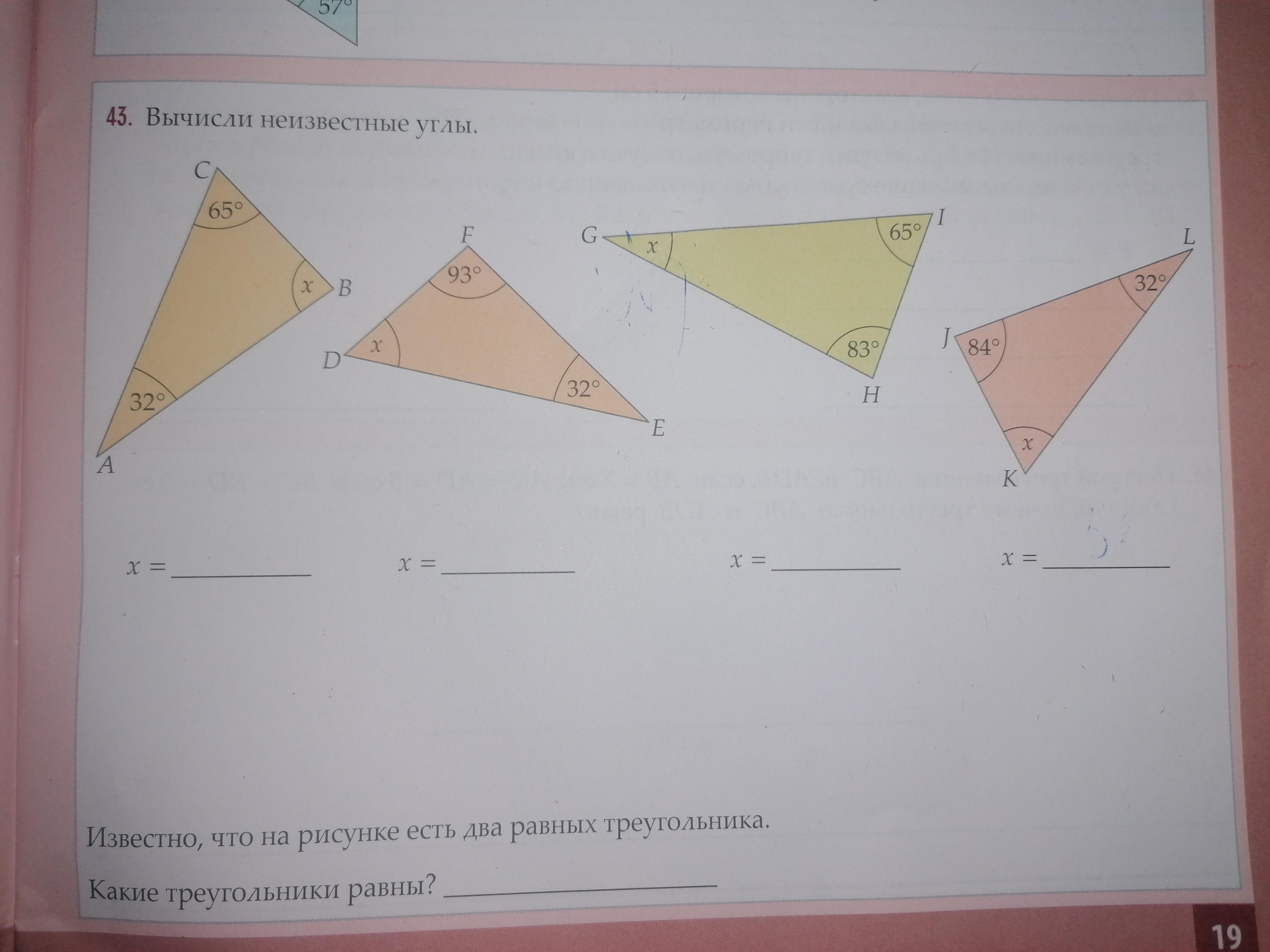 Так как сумма всех внутренних углов равна 180°,то х=180-65-32= 83 °