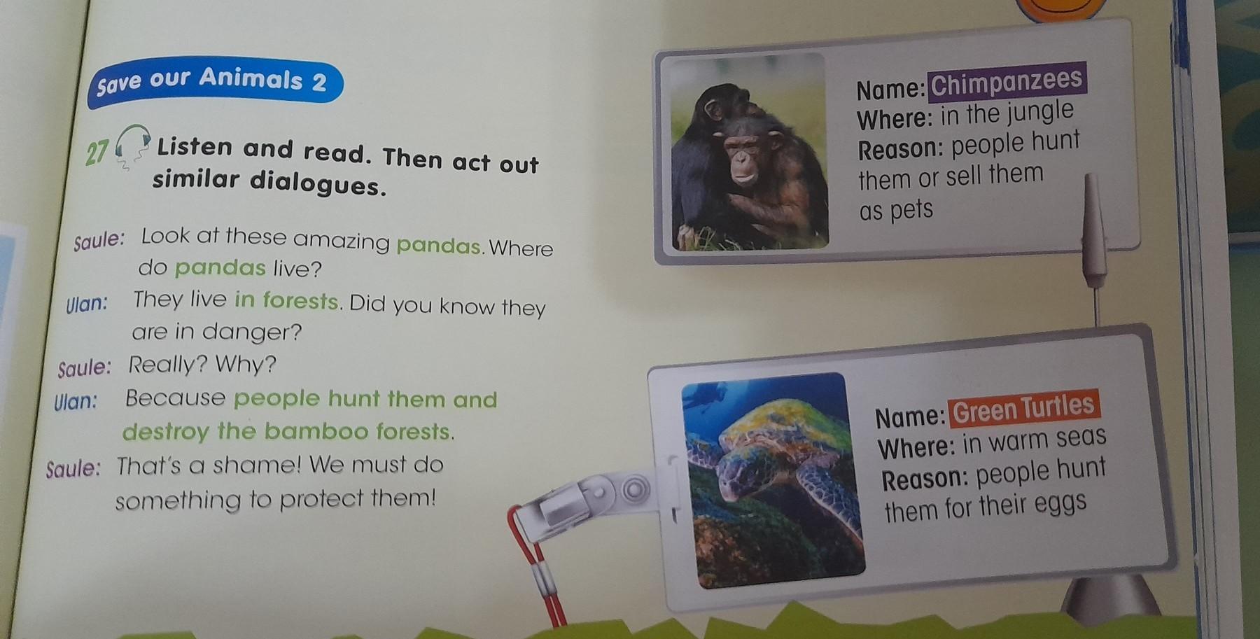 our Animals 2 Save Name:Chimpanzees Where: in the jungle Reason: people hunt them or sell them as pets Listen and read. Then act out similar dialogues. le look at these amazing pandas. Where do pandas live? They live in forests. Did you know they are in danger? Soule: Really? Why? en because people hunt them and destroy the bamboo forests. Szule: That's a shame! We must do something to protect them! Name: Green Turtles Where: in warm seas Reason: people hunt them for their eggs