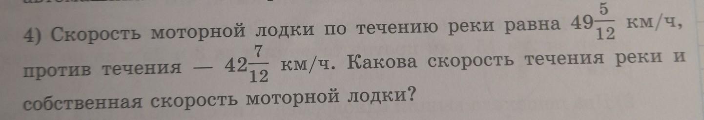 1) 49⁵/₁₂ + 42⁷/₁₂ = (49+42)+(⁵/₁₂+⁷/₁₂) = 91+1=92 (км/ч) - удвоенная собственная скорость лодки