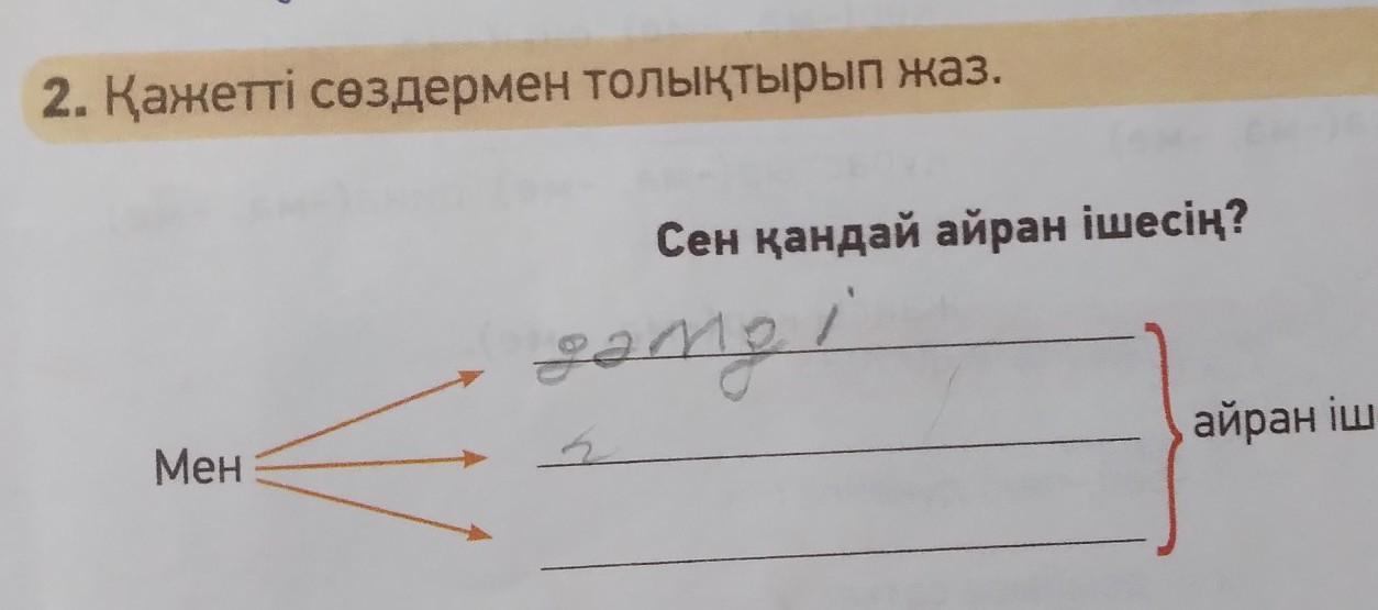 2. Қажетті сөздермен толықтырып жаз. Сен қандай айран ішесің? Мен айран ішемін. пж 1