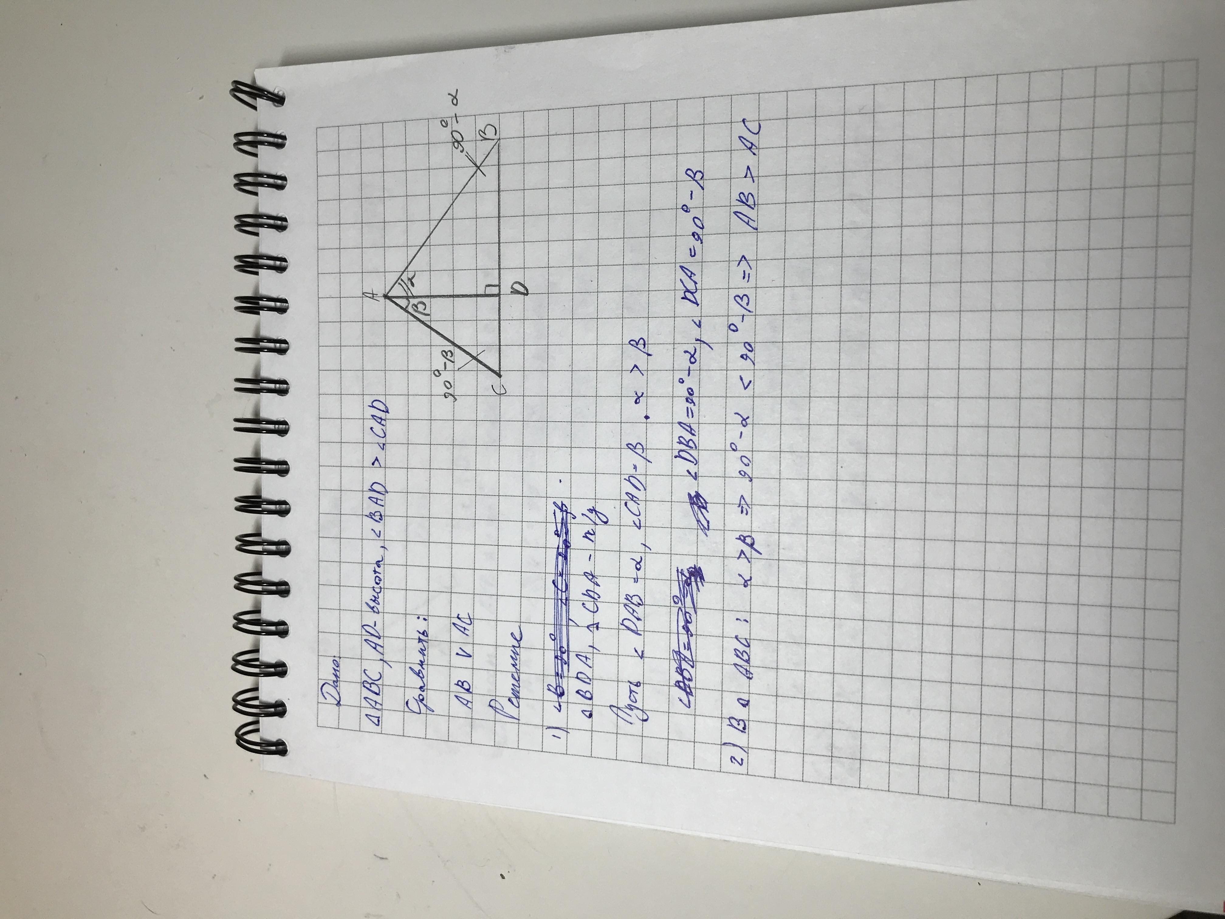 Основание D высоты AD треугольника ABC лежит на стороне BC, причем угол BAD больше угла CAD, Что больше, AB или AC?