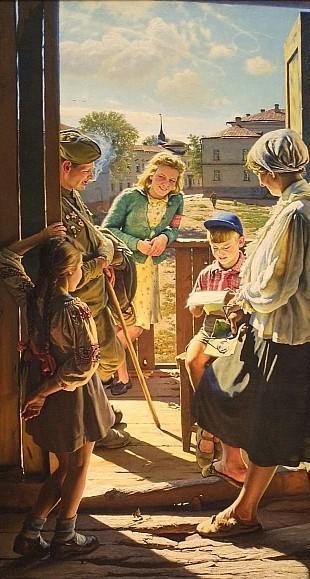 родители сидели дома ничего не подозревая. они услышали стук в дверь. мама пошла открывать дверь, а на пороге стоял её муж вернувшись с войны. дети быстро подбежали. солдат обнял их, и подарил мальчику книжку. солдат был хоть ранен, но также бодр. тут побежала старшая сестра. она была в большом удивление когда увидела отца. дальше они пошли домой.